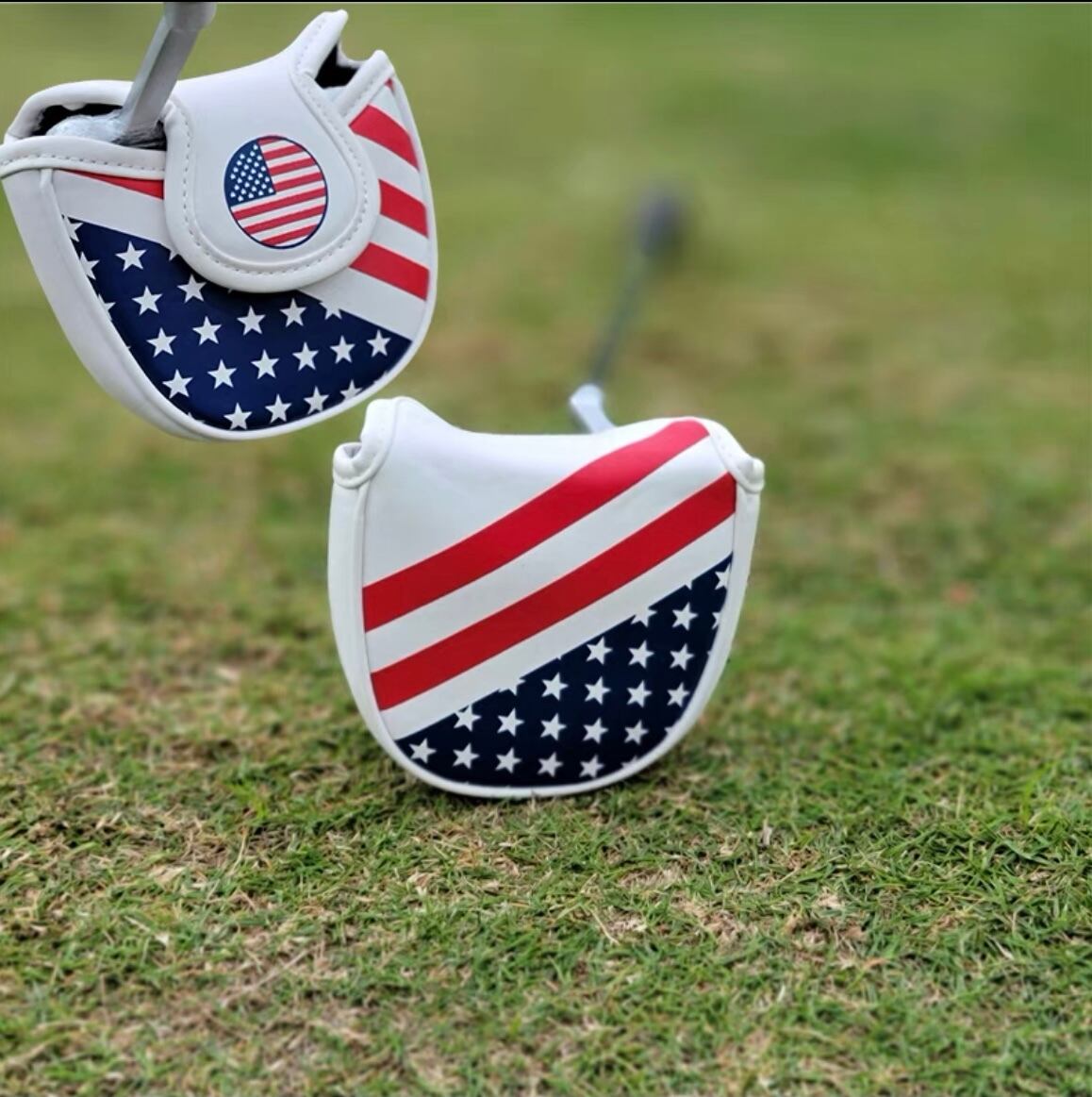 ゴルフパターカバー高級PUレザー製マレット磁石タイプ開閉 アメリカ国旗 ホワイト